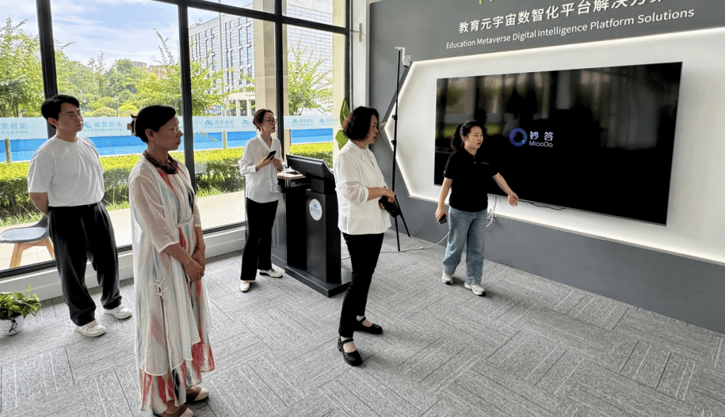 学院代表团首先到访成都威爱数矩(威爱科技数智化教育事业部)办事处。营销经理吴敏详细介绍公司发展概况、元宇宙及VR/MR业务布局,以及AI-LBE(locations Based Education)驱动下的“AI大模型元宇宙沉浸式交互技术联合研发中心”的建设与荣誉。